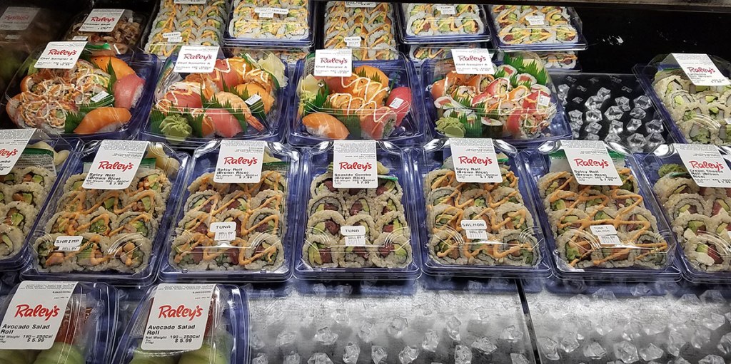 Across the street, the high-end Raley’s supermarket carries a wider selection of sushi freshly made by the in-store sushi chef. I watched as she prepared the day’s product, and she even offered to make anything that wasn’t already available. I didn’t buy anything that day, but I’ve tried Raley’s sushi before and can attest that it looks and tastes the same as sushi I’ve eaten at Japanese restaurants. The prices are about the same as restaurant sushi as well.