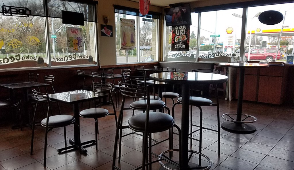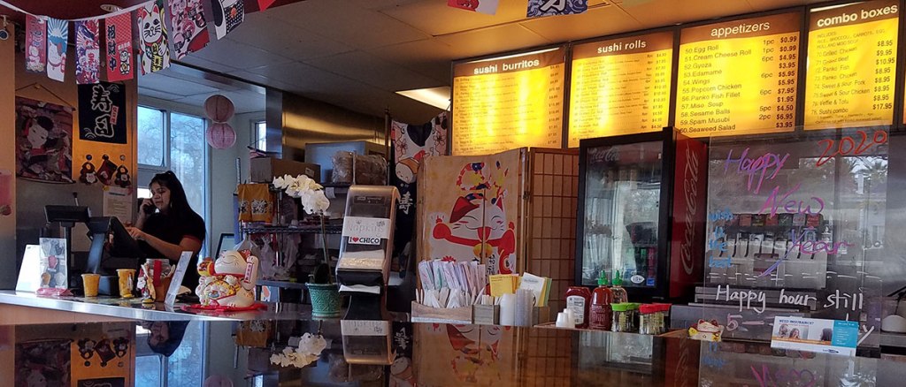 Chico, California has ten restaurants that serve sushi. They range from the award-winning Japanese Blossoms to fast food Sushi Burrito King. On a recent visit to Sushi Burrito King, I observed no customers eating inside the restaurant. Instead, most customers opted to use the drive-through or take-out their order, suggesting that it was popular for people looking for a quick meal on the go.