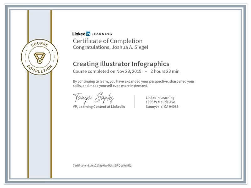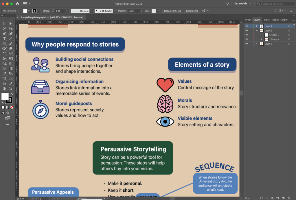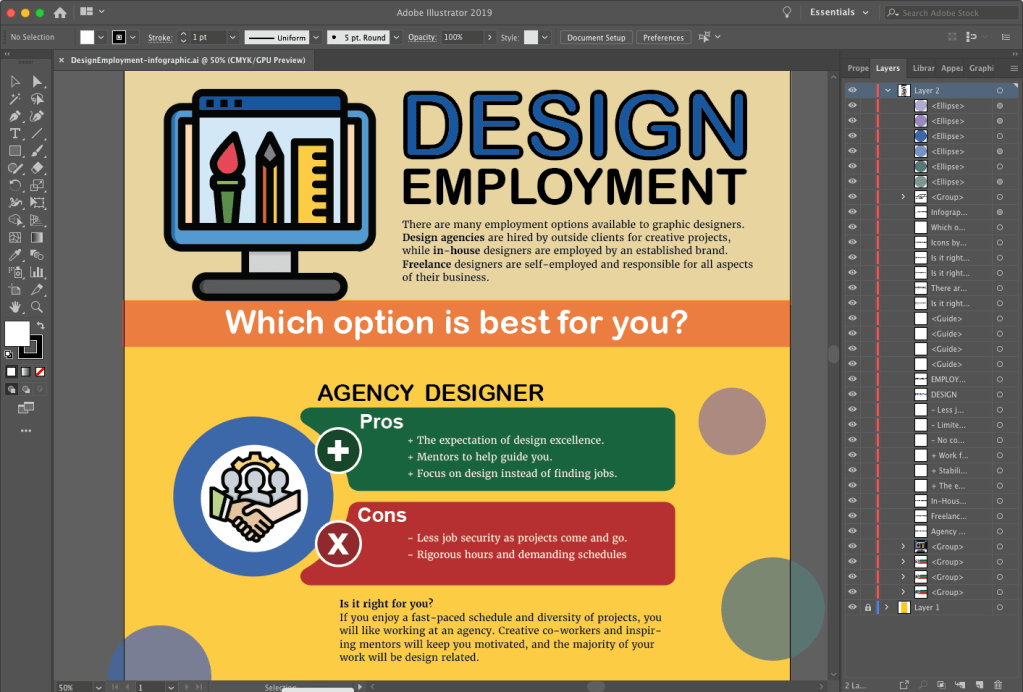 Adobe Illustrator is a powerful tool for designing vector graphic. I have used Illustrator to create infographics for previous assignments, and it appears to be the preferred tool for most infographic designers. For example, a search for “infographics” on LinkedIn Learning showed many courses focused on Illustrator as the primary software used. Although Illustrator is powerful and easy to use, I discovered its limitations when designing the Boxpark Sushi survey results infographic.
